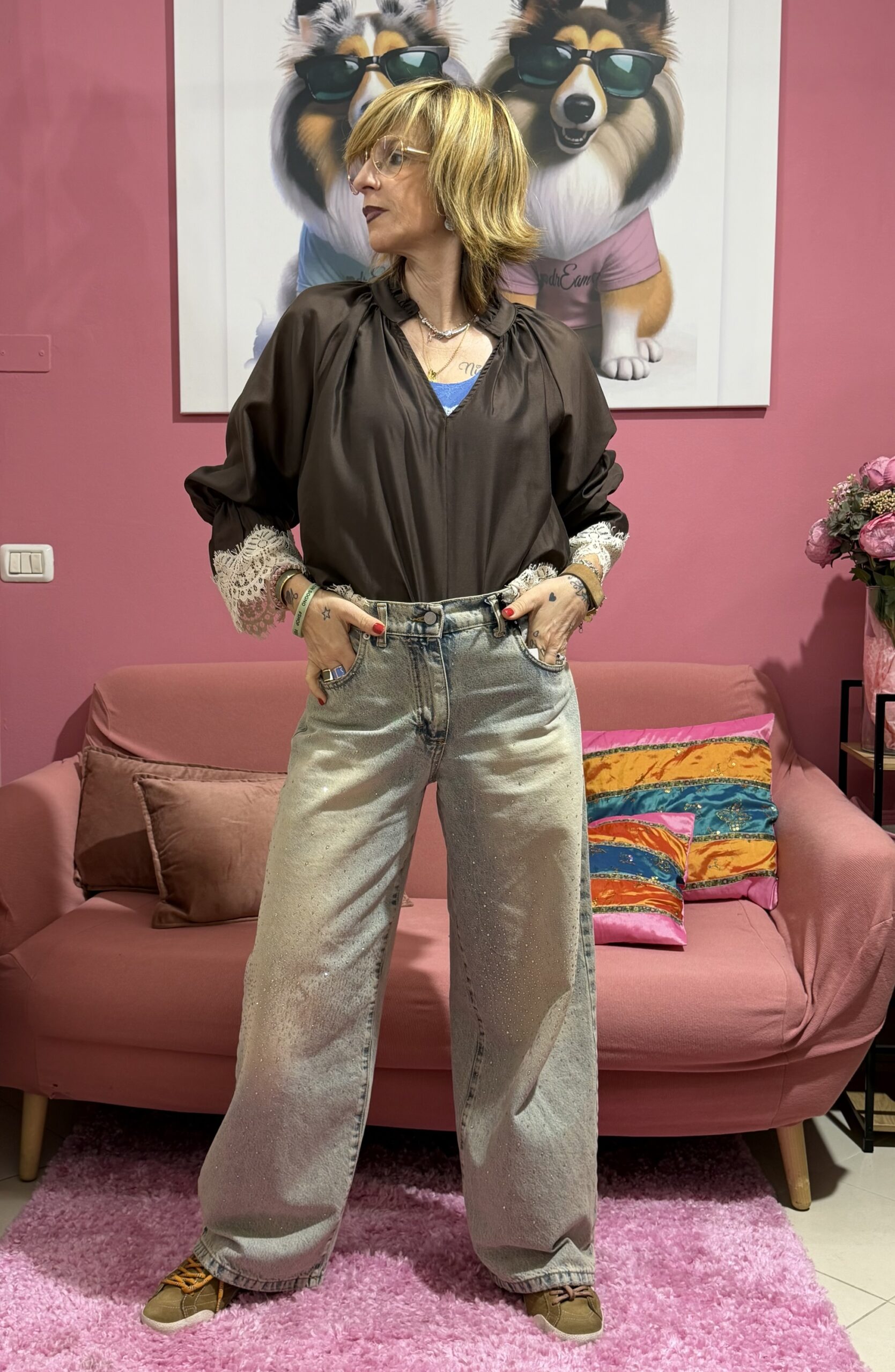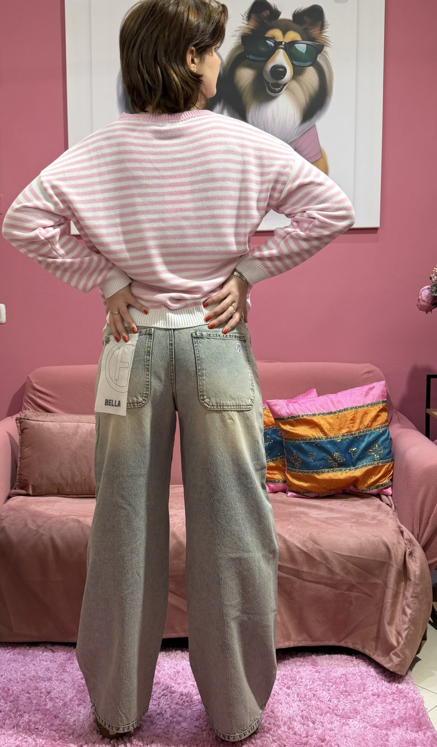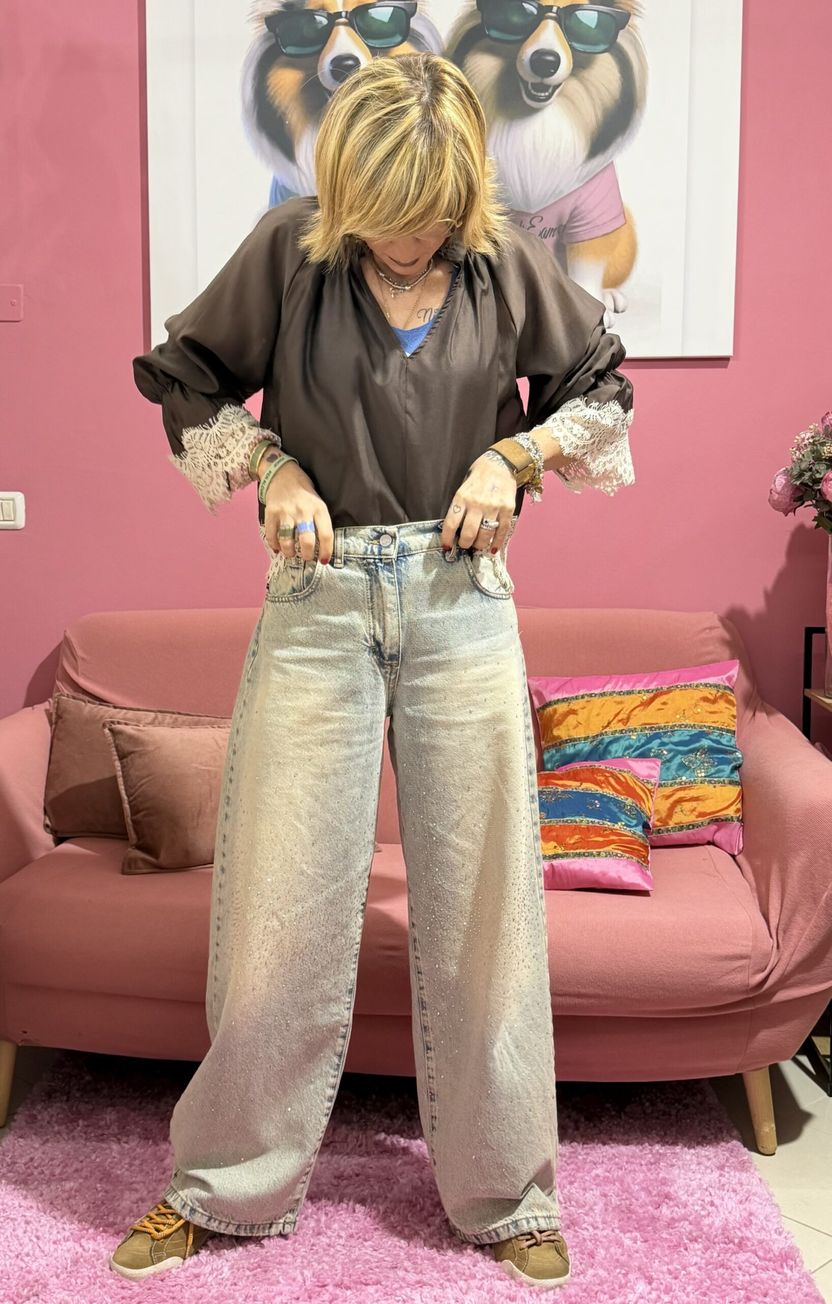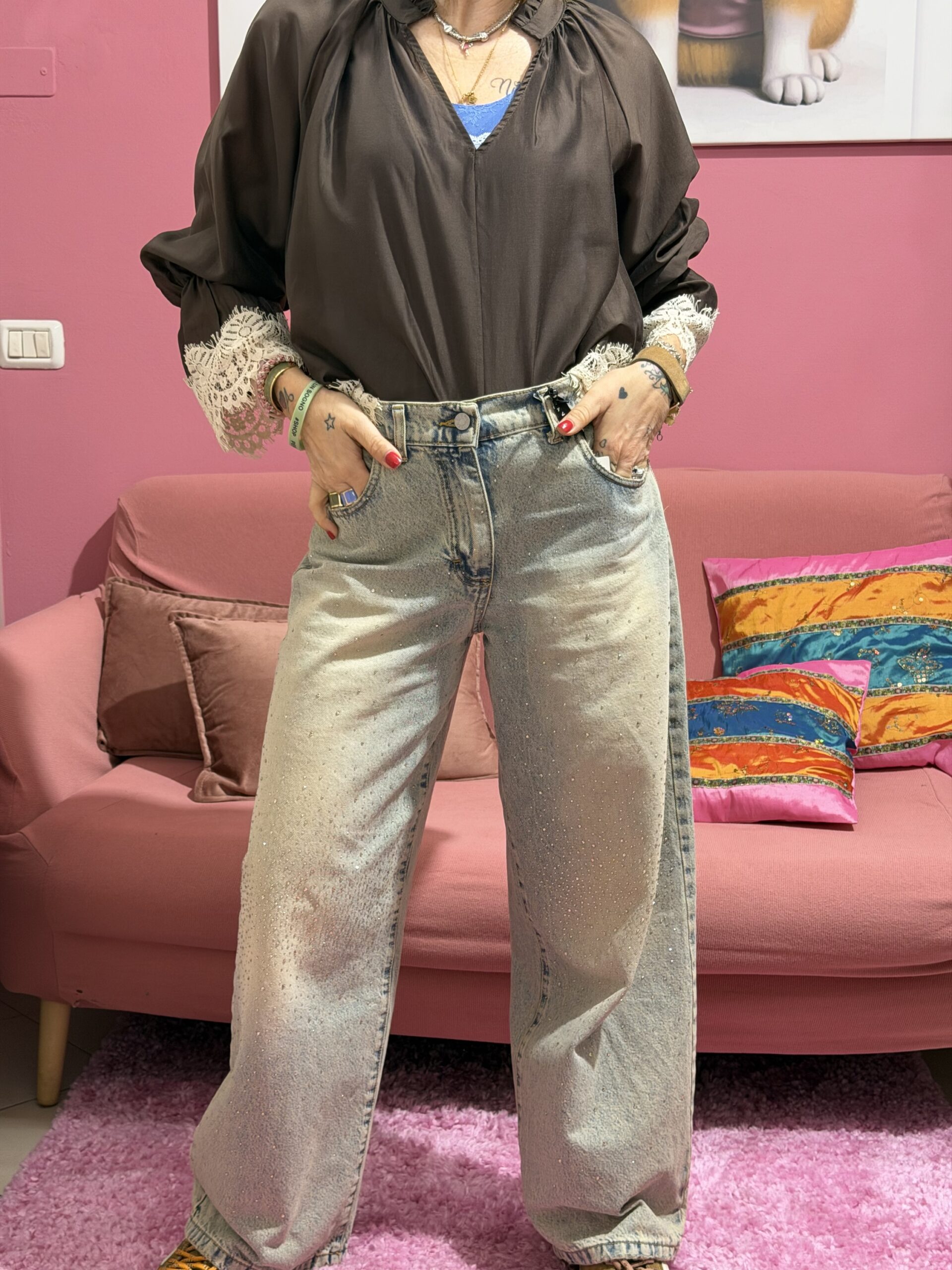 Realizzato in denim effetto vintage, presenta una gamba ampia e morbida che garantisce comfort e una vestibilità contemporanea. Il dettaglio che lo rende speciale è la presenza di piccoli strass sul davanti, che donano luce e rendono il jeans più particolare senza risultare eccessivo.
