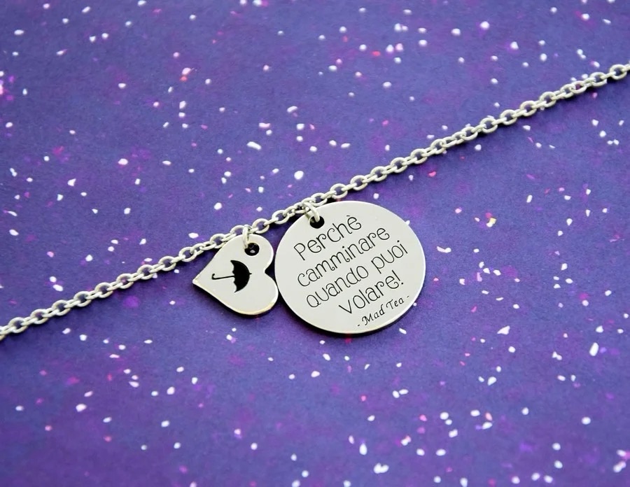 Bracciale composto da targhetta con incisa la frase “Perchè camminare quando puoi volare” e piccolo cuoricino con inciso il magico ombrello di Mary Poppins.
