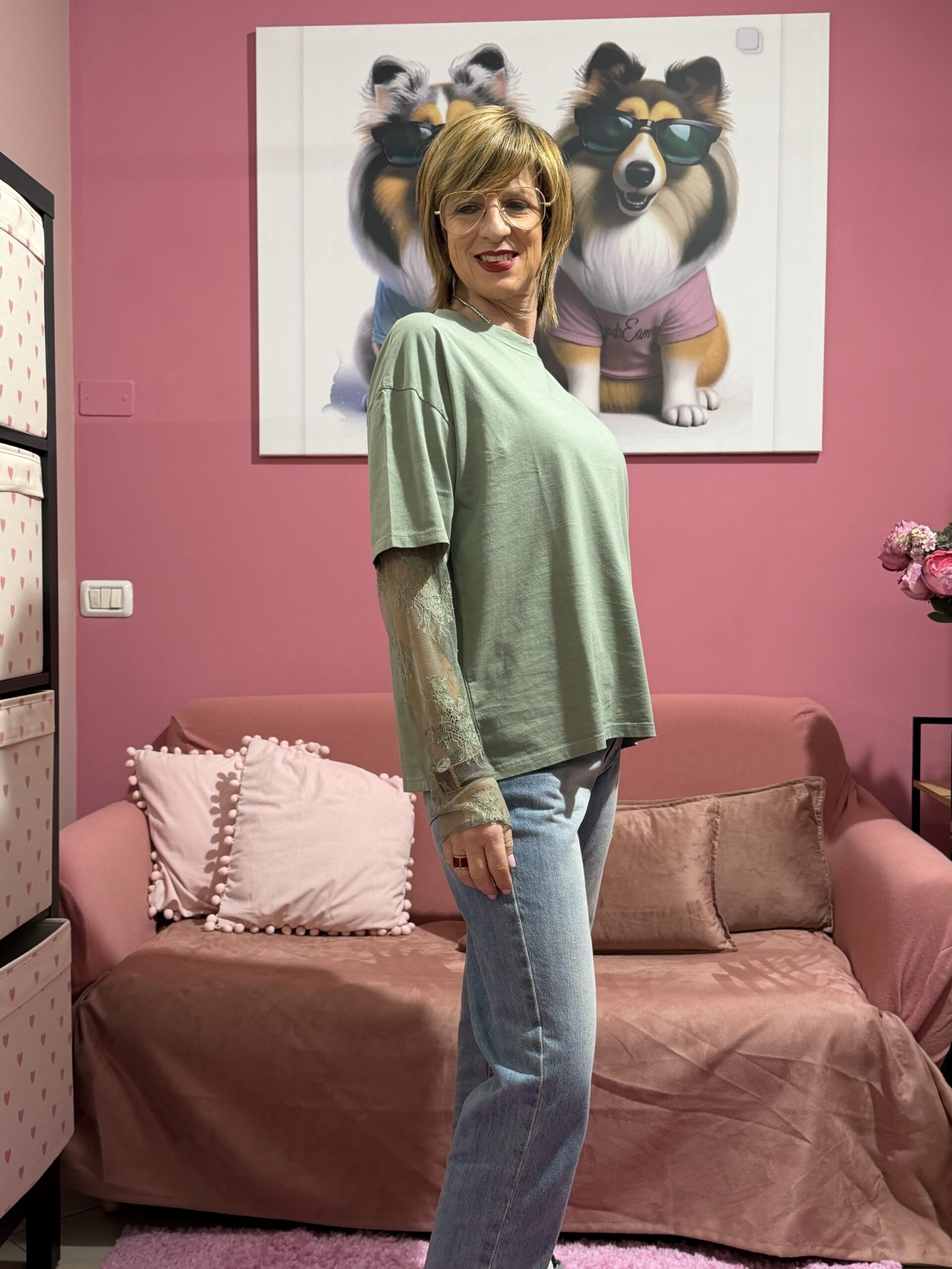 Questa t-shirt nasce come modello semplice, pulito, dalla linea morbida e leggermente rilassata, ma si distingue per il dettaglio delle maniche già applicate in pizzo, che creano un raffinato effetto layering senza dover aggiungere nulla.